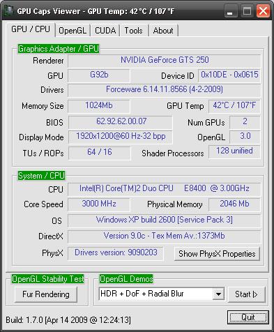 драйверах, текущие температуры, свойства подсистемы OpenGL.